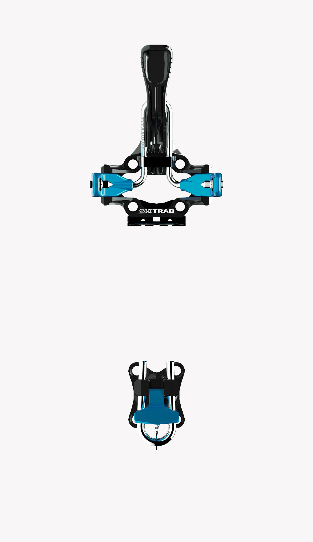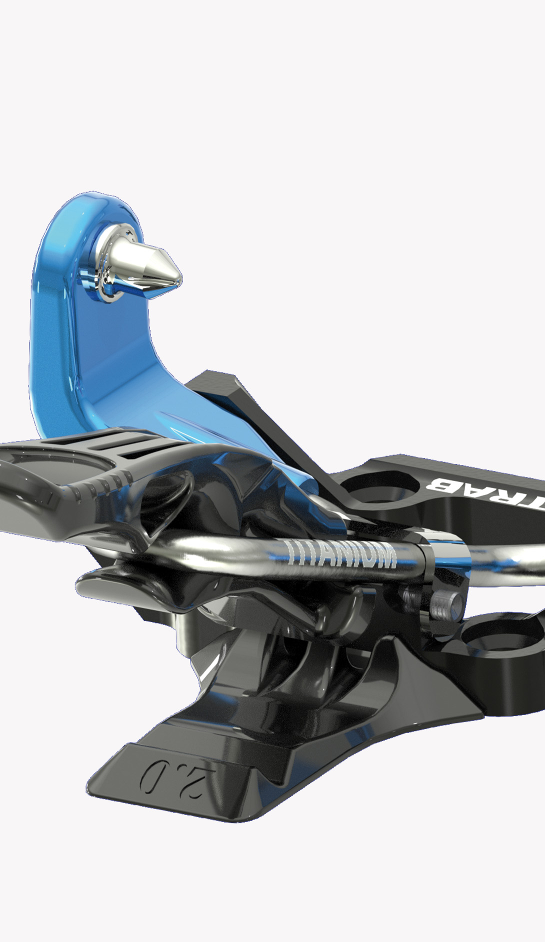 One simple component in titanium specially designed in its shape and structure links the two jaws in the toe unit. This extremely simple mechanism offers a significant guarantee of functionality and reliability. The toe unit jaws open with a light pressure on the front lever, which can be pressed either by hand or with a ski pole. Position the boot so that the jaw pins are level with the holes on the side of the boot, then release the lever so the jaws close locking the toe of the boot into place. Rotate the lever upwards to block the opening of the jaws. This special elastic component in titanium permits the toe unit to adapt perfectly to all types of boots, guarantees that the boot remains fixed in place and with the help of some particularly well finished and crafted pins it can clean out the boot inserts during use.