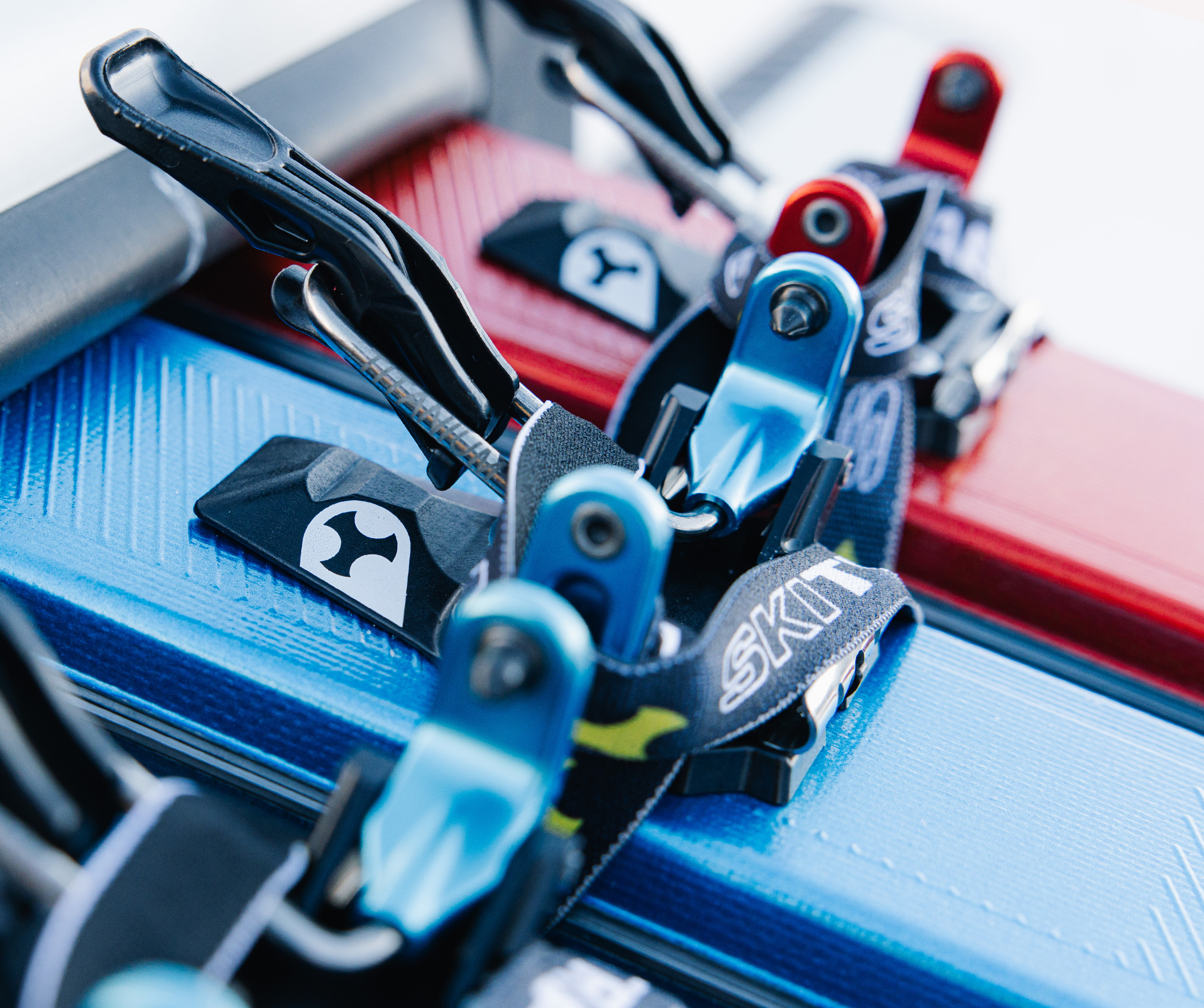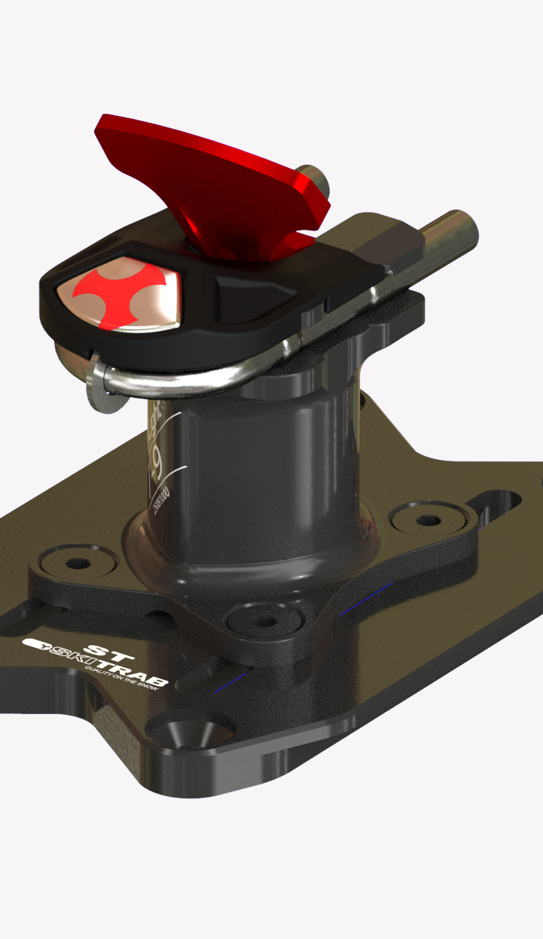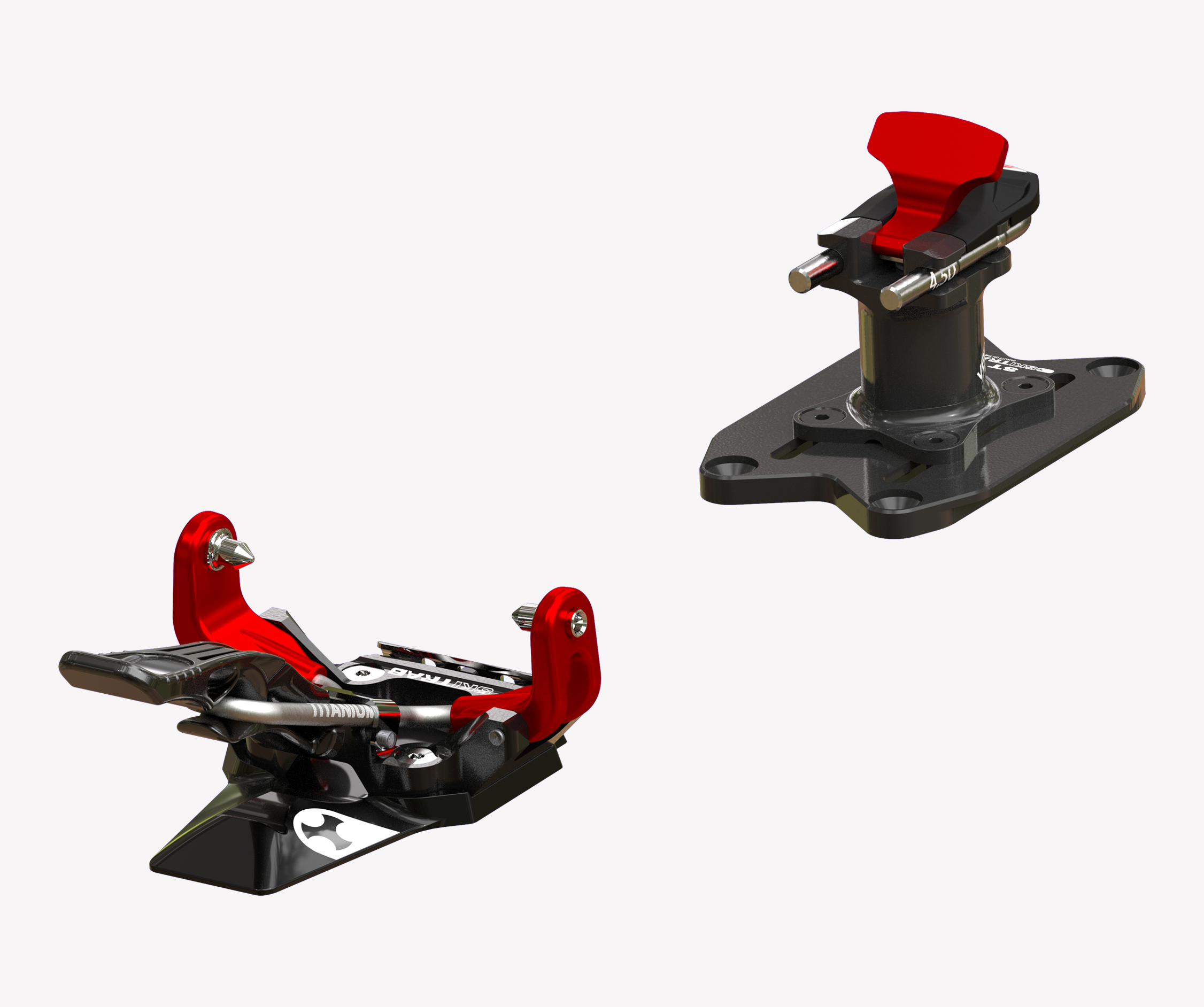 One simple component in titanium specially designed in its shape and structure links the two jaws in the toe unit. This extremely simple mechanism offers a significant guarantee of functionality and reliability. The toe unit jaws open with a light pressure on the front lever, which can be pressed either by hand or with a ski pole. Position the boot so that the jaw pins are level with the holes on the side of the boot, then release the lever so the jaws close locking the toe of the boot into place. Rotate the lever upwards to block the opening of the jaws. This special elastic component in titanium permits the toe unit to adapt perfectly to all types of boots, guarantees that the boot remains fixed in place and with the help of some particularly well finished and crafted pins it can clean out the boot inserts during use.